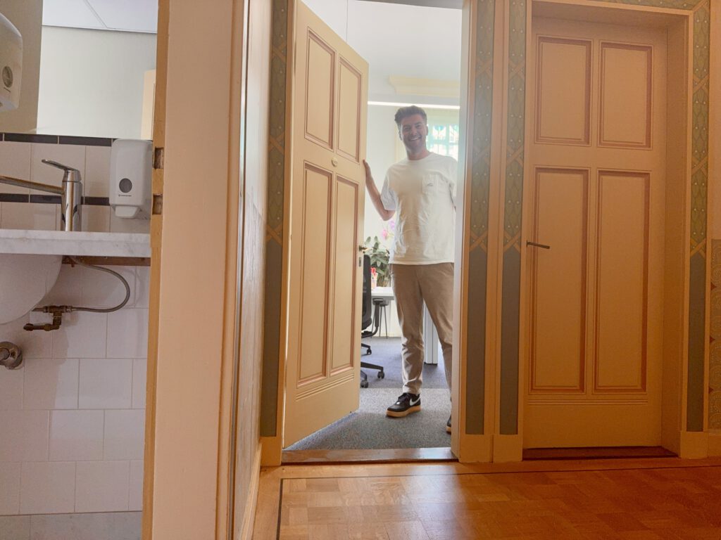 Gewoon de trap op, de deur naast het toilet. Dan zit je goed.